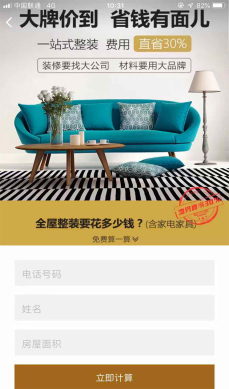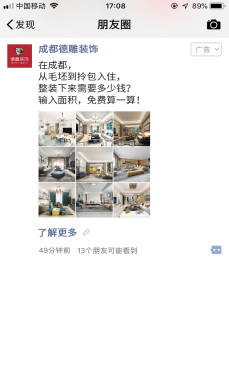 成都德雕装饰与联媒合作投放朋友圈广告,作为本地装修品牌本次推广意在针对成都地区收集销售线索。落地页内通过大量装修精美的室内样片赢得消费者好感,通过logo墙展示合作的一线品牌厂家,向消费者传递“一站式、省心、安全”的装修理念,落地页内“立即计算”按钮点击输入信息可获取详细报价,借此吸引用户留下客资信息。本次推广曝光量突破430万+,点击率高达3%,针对目标人群,投放精准,有效的达到了收集客资的目的,为后续的销售跟进打下坚实基础。